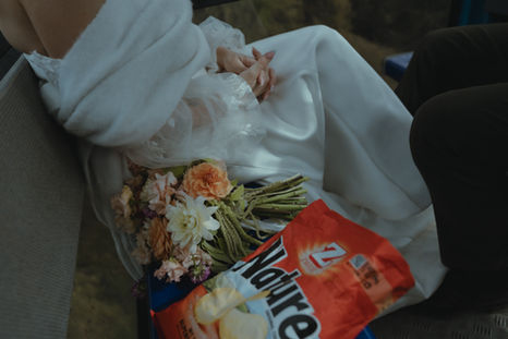 Elle accompagne notamment certaines fugues amoureuses imaginées par Morgane Raposo — des élopements hors cadre, intimes et libres — pour lesquels le geste floral vient soutenir l’atmosphère et dialoguer avec le paysage.